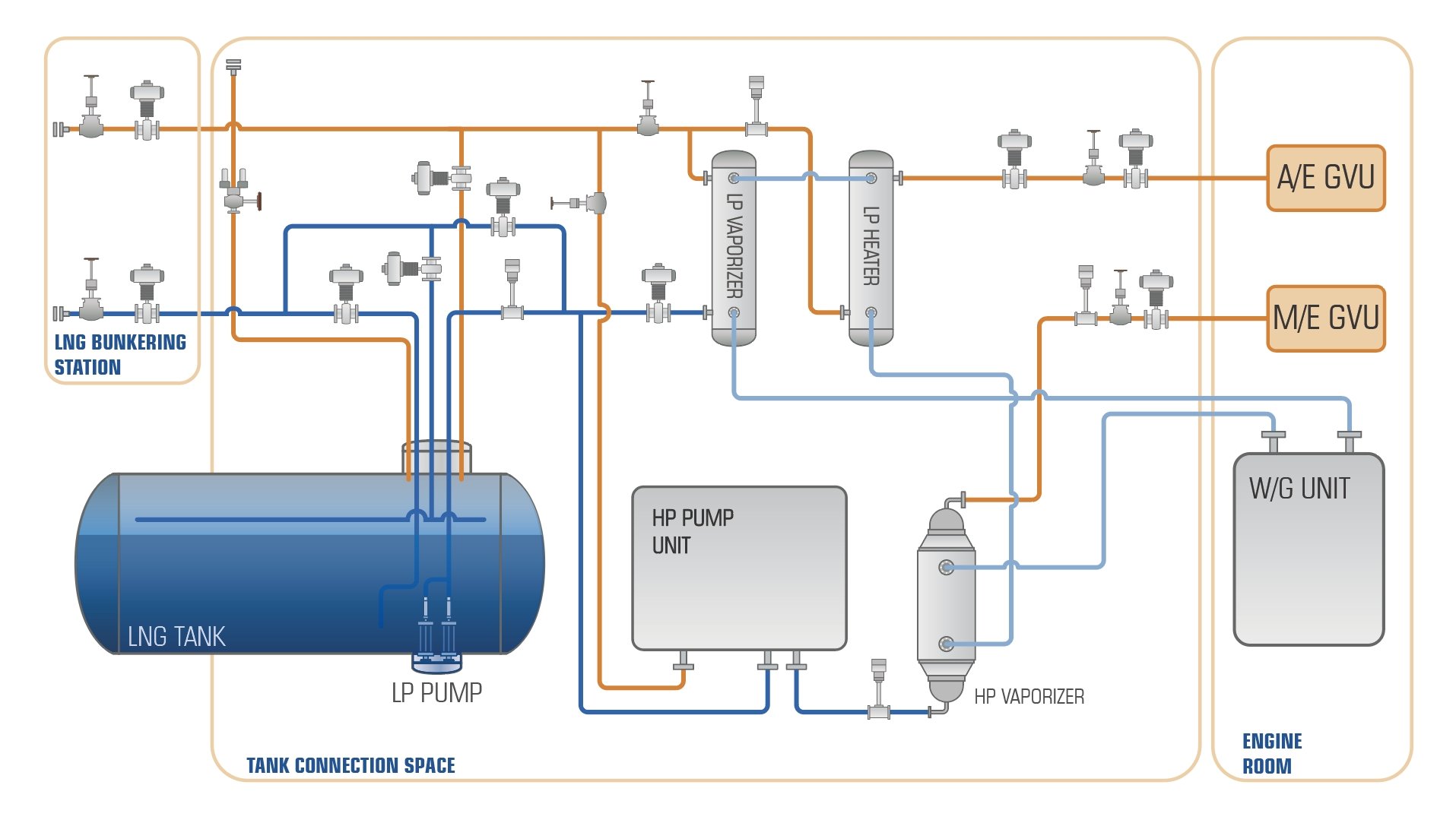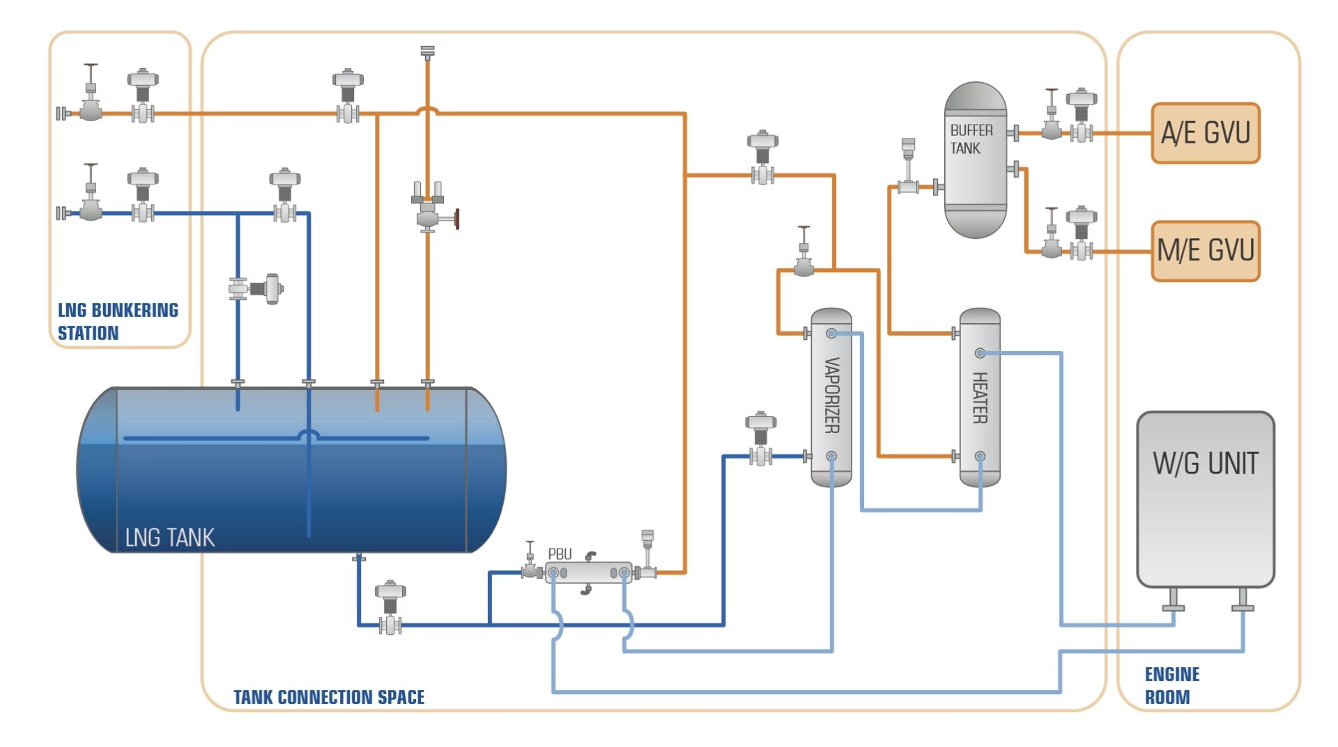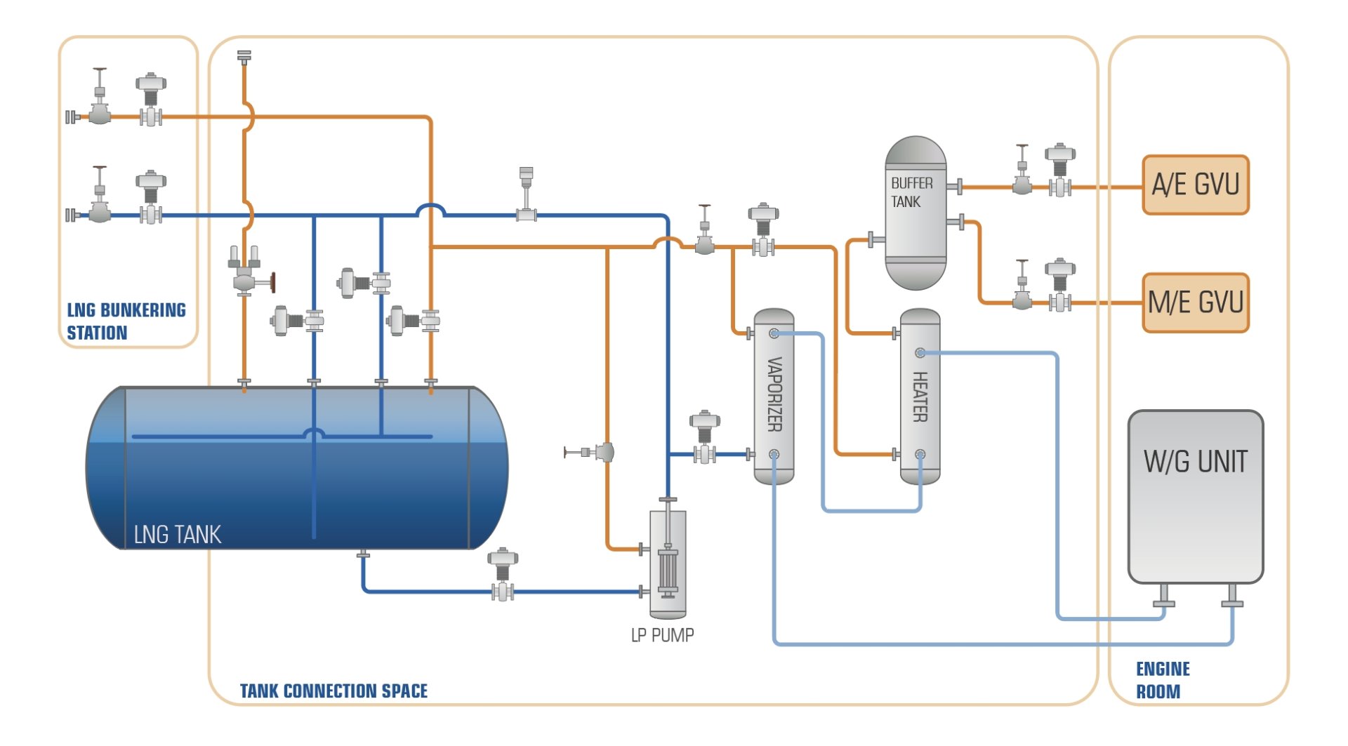 整個氣體工藝包采用定制化開發(fā)/模塊化設計,可根據(jù)船舶布置實現(xiàn)布局的最優(yōu)化。天然氣經中間介質加熱,降低天然氣與熱源之間的交叉泄漏風險,同時確保在不同航區(qū)不同環(huán)境條件下供氣系統(tǒng)和加熱單元的靈活性和穩(wěn)定性。