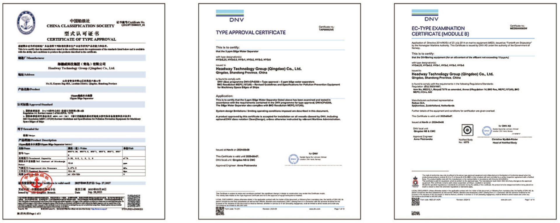目前,海洋衛士?艙底水分離器已取得CCS、DNV型式認可證書和EC認可證書。