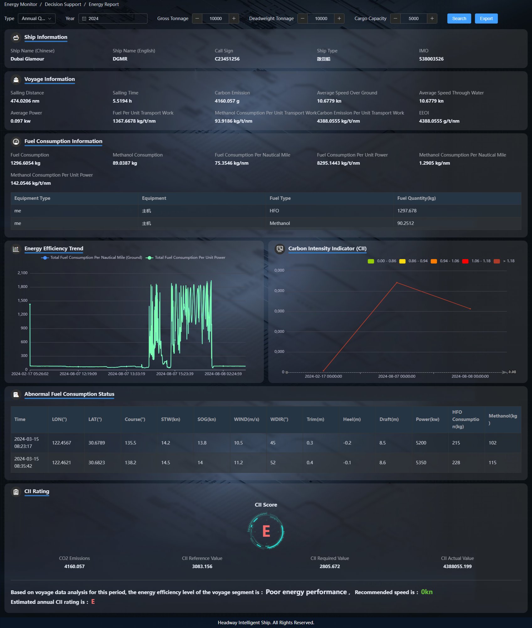 基于智能信息集成平臺,實時監(jiān)測船舶航行各個關鍵指標,運用現(xiàn)代化船舶能效管理的系統(tǒng)性方法,對船舶能源消耗、能源利用效率和二氧化碳排放進行嚴格的控制和管理,提高船舶能效,減少設備自身或人為因素造成的額外消耗,實現(xiàn)船舶節(jié)能減排的能效要求,推動航運綠色發(fā)展。